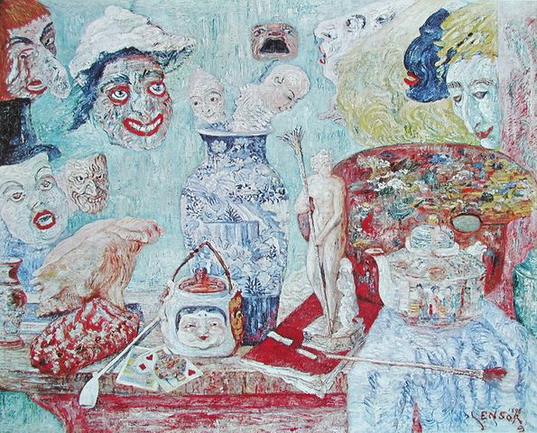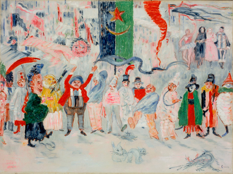 代表作《キリストのブリュッセル入城》では、宗教的主題であるはずのキリストは、雑踏の中に埋もれ、ほとんど見分けがつかない。
