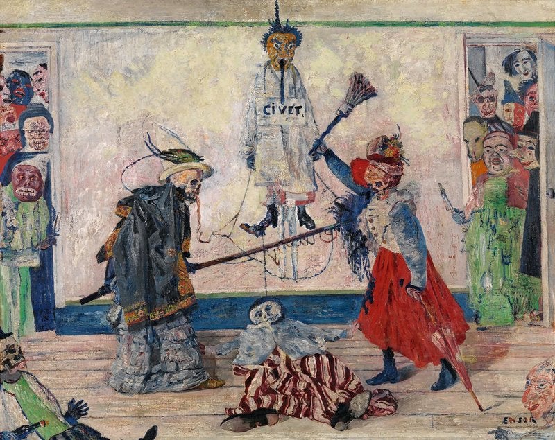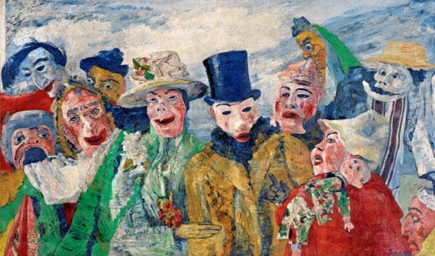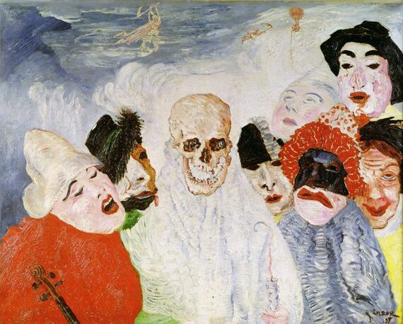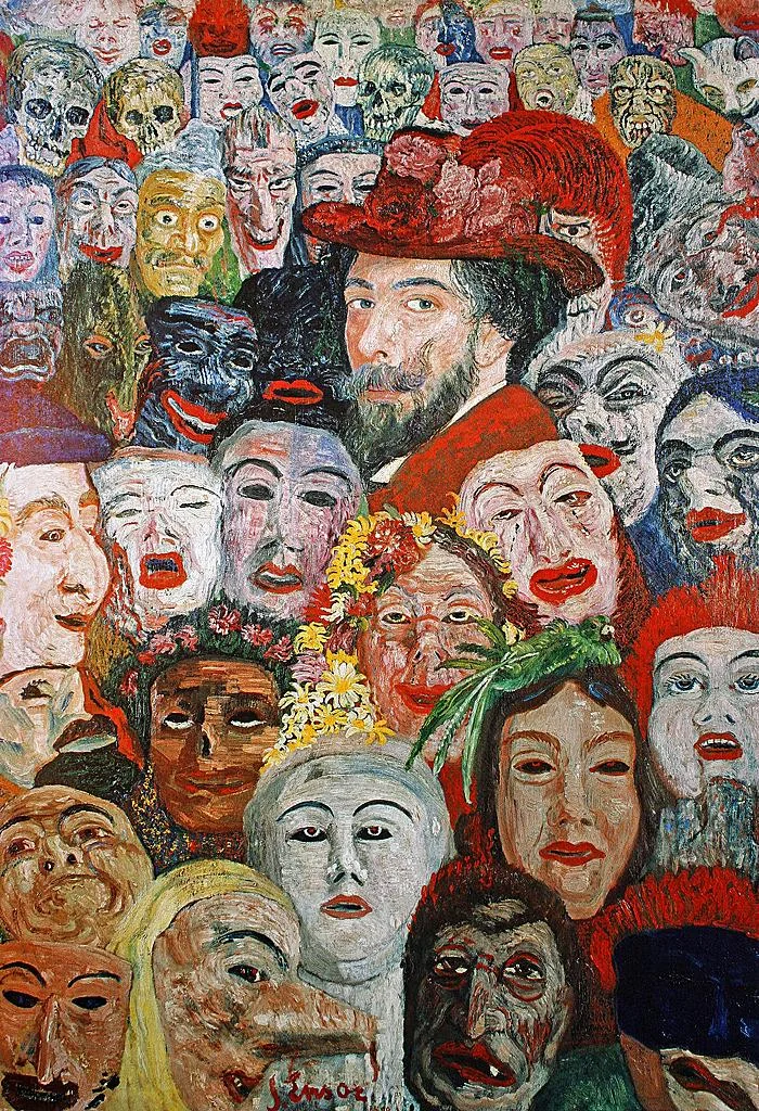 仮面は本来、何かを隠すためのものだが、アンソールの世界では、すべての顔がすでに仮面のように見える。