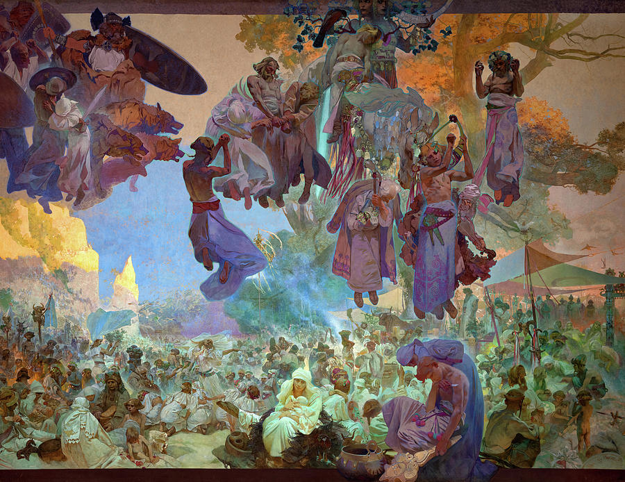 晩年に彼が取り組んだ《スラヴ叙事詩》では、これまでに獲得した装飾的な語彙を用いながら、スラヴ民族の歴史や神話が大きなスケールで描かれる。