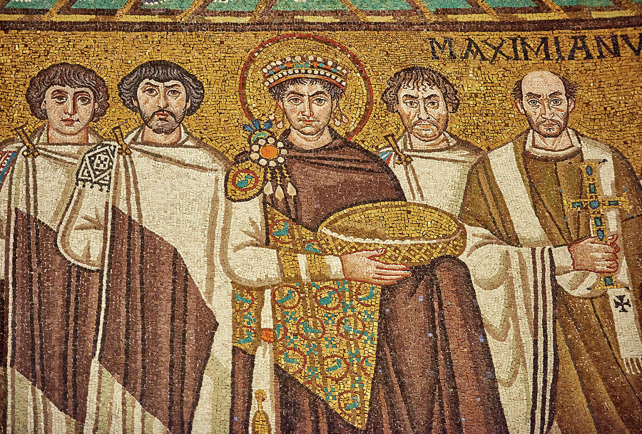 出典:Artpedia/ビザンチンのモザイク 「ユスティニアヌス帝と廷臣たち」(部分)