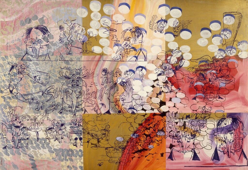 こうしたベックの変化を、美術の側に仮に対応させてみると、もう少し具体的な構図が見えてくる。たとえば、ローファイの粗さと雑多な引用がぶつかり合う『Mellow Gold』の感触は、ポップカルチャーや政治、漫画的誇張を過剰に混ぜ込みながら暴走するピーター・ソールの絵画に近い。そこでは品位よりもエネルギーが優先され、引用は整理される前のまま画面に投げ込まれる。世界はまだ雑然としており、その雑然さ自体が表現のエンジンになっている。