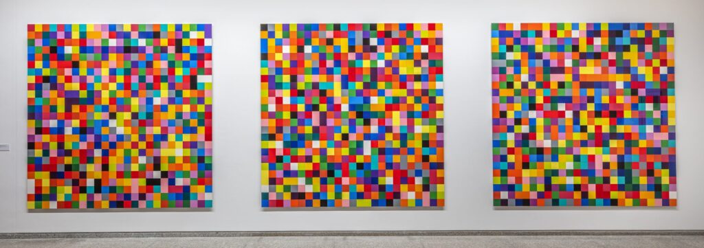 カラーチャート作品やガラス作品も、この文脈で捉えると位置づけが明確になる。工業的に規格化された色見本を並べたカラーチャートは、エルズワース・ケリーやミニマリズムの色彩研究と視覚的には似ている。しかし、リヒターにおいて色は構成や調和のための要素ではなく、すでに制度化されたもの、既成の秩序として扱われる。そこに感情や主体的判断が入り込む余地は、極端に制限されている。