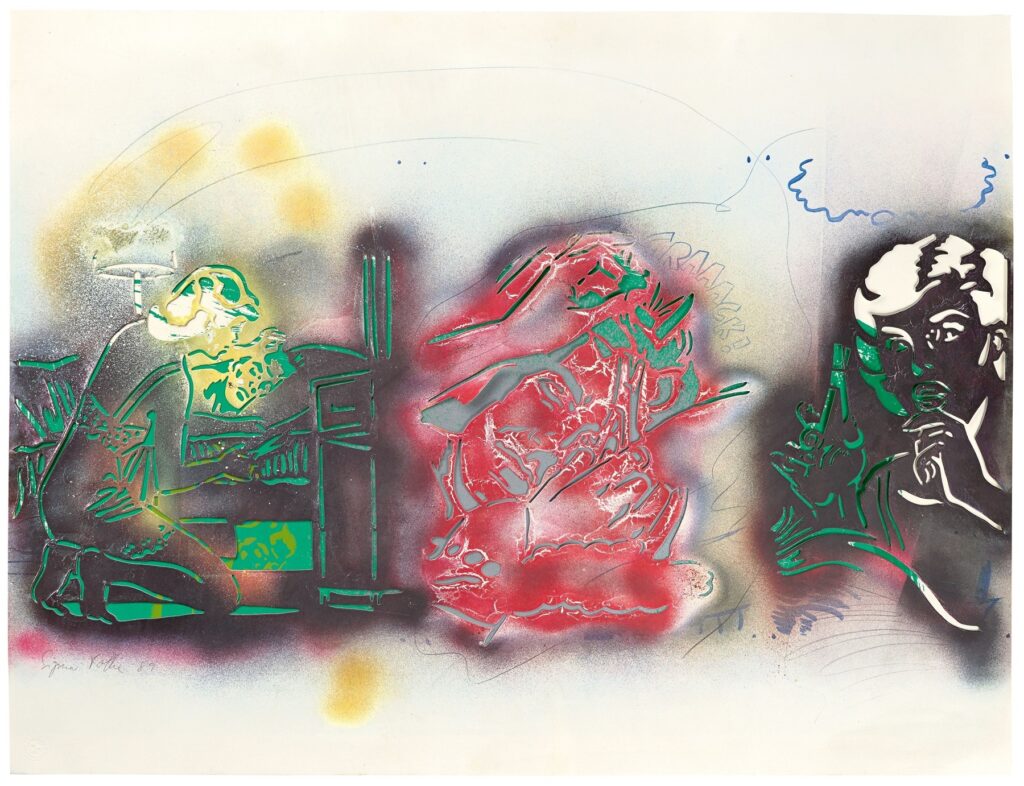 ポルケの初期作品には、新聞写真や広告イメージを参照した具象的モチーフが多く見られる。ラスター(網点)を強調した描写は、対象を鮮明に伝えるどころか、むしろ像を不確かにし、「私たちは何を見ているのか」という問いを画面に残す。ここで行われているのは社会批評というより、イメージそのものへの懐疑である。描かれているのは対象ではなく、対象がどのように複製され、流通し、信じられてしまうかというプロセスだ。