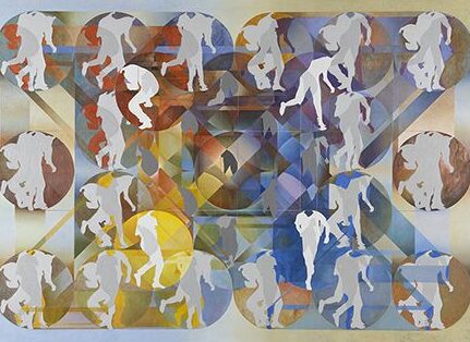 宇佐美の代表的なモチーフのひとつに、反復される「人の形」がある。それらは誰かを描いた人物像ではなく、顔も個性も剥ぎ取られた、匿名的なシルエットに近い。しかもその姿勢は、四種類前後の限られた型に収束している。立つ、動く、腕を上げる、身をかがめる。これらは感情を表すジェスチャーではなく、社会的緊張の極限で人が取らされる、最小限の身体動作である。