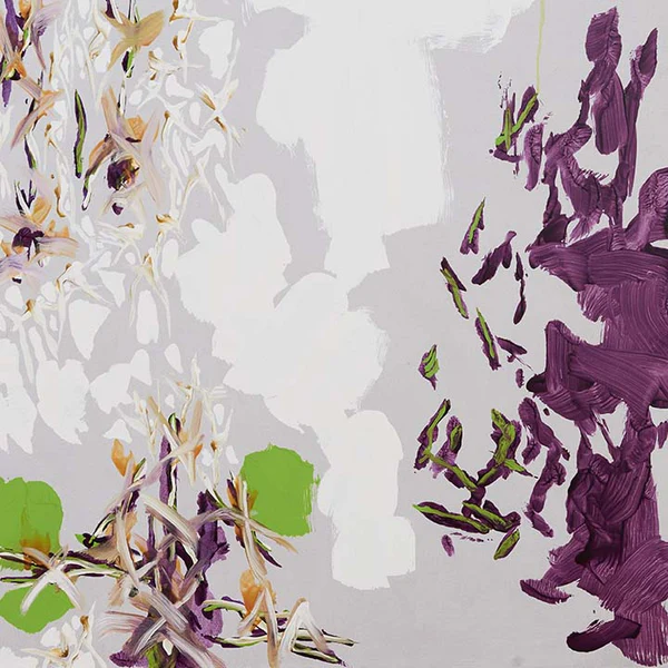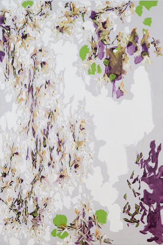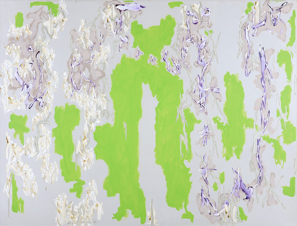 セゾン美術館で展示された中西夏之の絵画群、とりわけ緑、白、紫を基調とした作品は、色面と線が絡み合いながら、不思議な空間感を生み出していた。明確な遠近法は用いられていないにもかかわらず、画面上には奥行きが感じられる。その要因のひとつが、色面の脇に置かれたグレーの、影のような輪郭である。このグレーは輪郭を強調するのではなく、逆に境界を曖昧にし、色面をわずかに浮かび上がらせる。