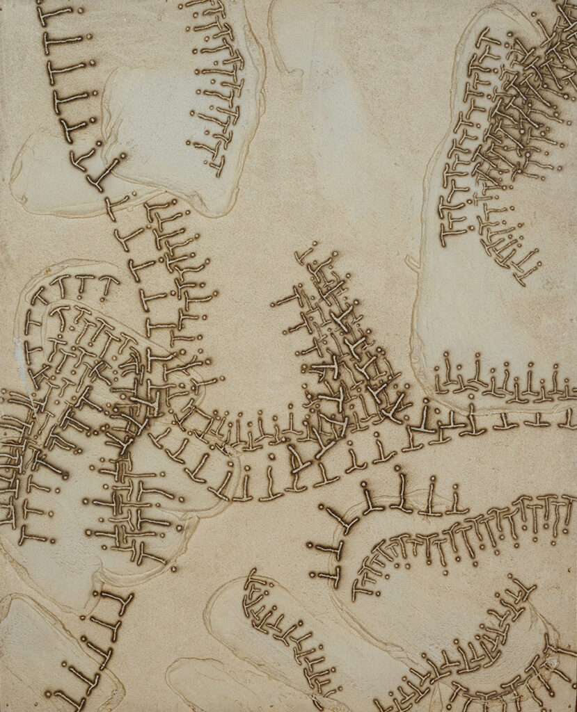 この転回は、ハイレッド・センターでの活動や、コンパクト・オブジェなどの実践とも連続しているが、とりわけ絵画において顕著に現れる。中西の絵画は、表現を削ぎ落とすことで純化を目指すのではなく、逆に、知覚の不確かさや揺らぎをそのまま画面に引き受ける。その結果として生まれるのが、像ではなく「場」としての絵画である。