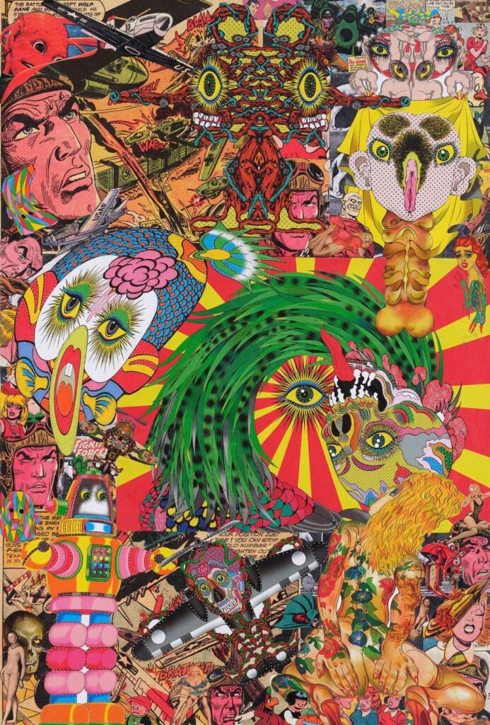 田名網敬一の作品世界を特徴づけるものとして、まず挙げられるのは、イメージが秩序を失ったまま増殖し続ける、その圧倒的な密度である。画面は常に飽和状態にあり、視線の焦点は定まらず、主題と背景の区別すら曖昧だ。そこには「何かを伝える」ための構図ではなく、「見えるという状態そのもの」を押し広げるような力が働いている。