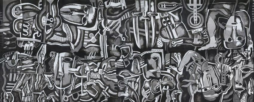 アル=アッザウィの絵画を理解するためには、まず「全体があって断片が生じる」という近代的世界観をいったん保留する必要がある。彼の制作においては、全体像は常に遅れてやってくる。最初にあるのは、ばらばらに存在する記憶、神話、暴力の痕跡、言葉にならない感覚であり、それらが同一平面に呼び集められることで、仮の秩序が立ち上がる。