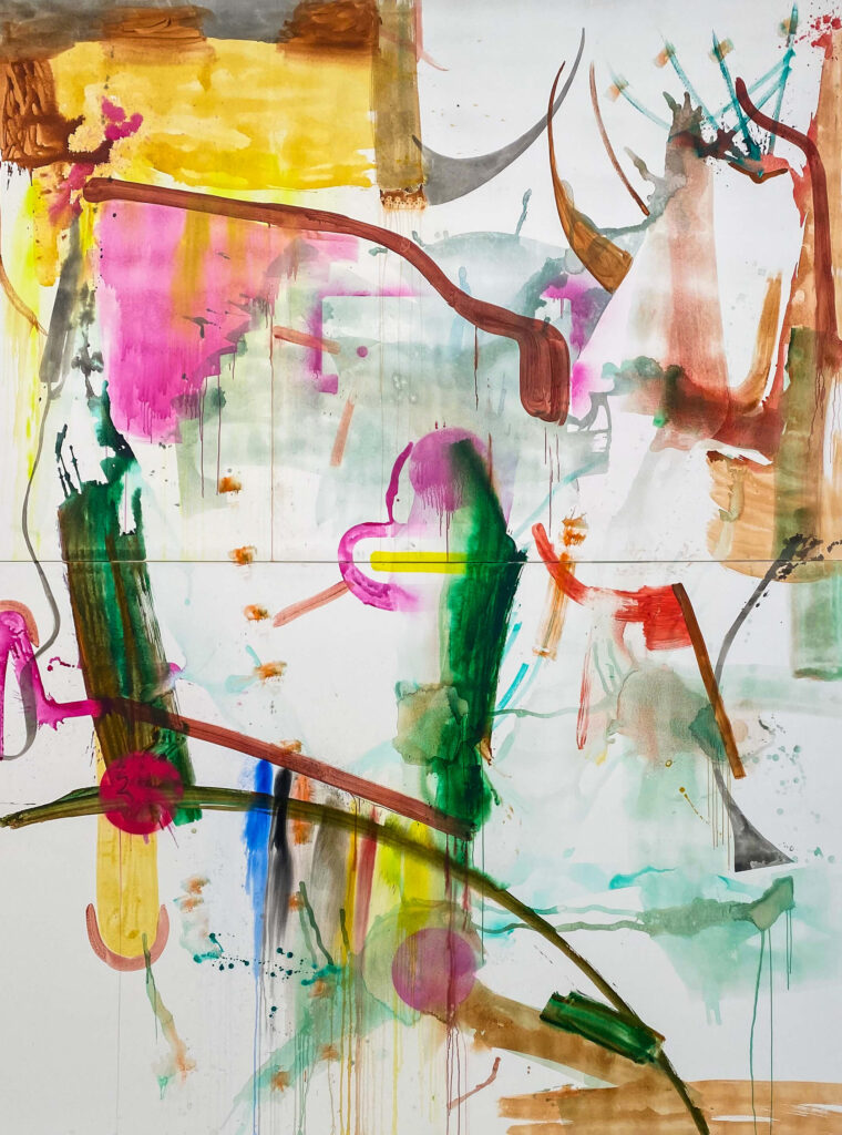 オーレンの抽象絵画は、スタイルというよりも状態と呼ぶ方が近い。そこには一貫したフォーマットや再現可能な方法論が見えにくい。ストロークは伸びやかで、肯定的でありながら、楽天的ではない。迷いがないように見えるが、強引さもない。この微妙なバランスは、意図的に設計されたものというより、身体が自然にそこへ入ってしまう状態に近い。