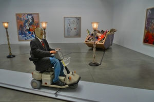 彼の絵画や彫刻は、ときに意図的に粗雑であり、引用やパロディが混在する。そこには、ネオ表現主義的な筆致の誇張もあれば、コンセプチュアルな自己言及もあり、さらに個人的な逸話や自虐的なユーモアが重ねられる。結果として作品は、特定の時間層に深く潜るというよりも、複数の時間が同時に表面に現れては消えるような構造を持つ。歴史的文脈を無視しているわけではないが、歴史を沈殿させることもしない。むしろ、時間の層を意図的に撹拌し、深さが形成される前の状態に戻してしまうような感覚がある。