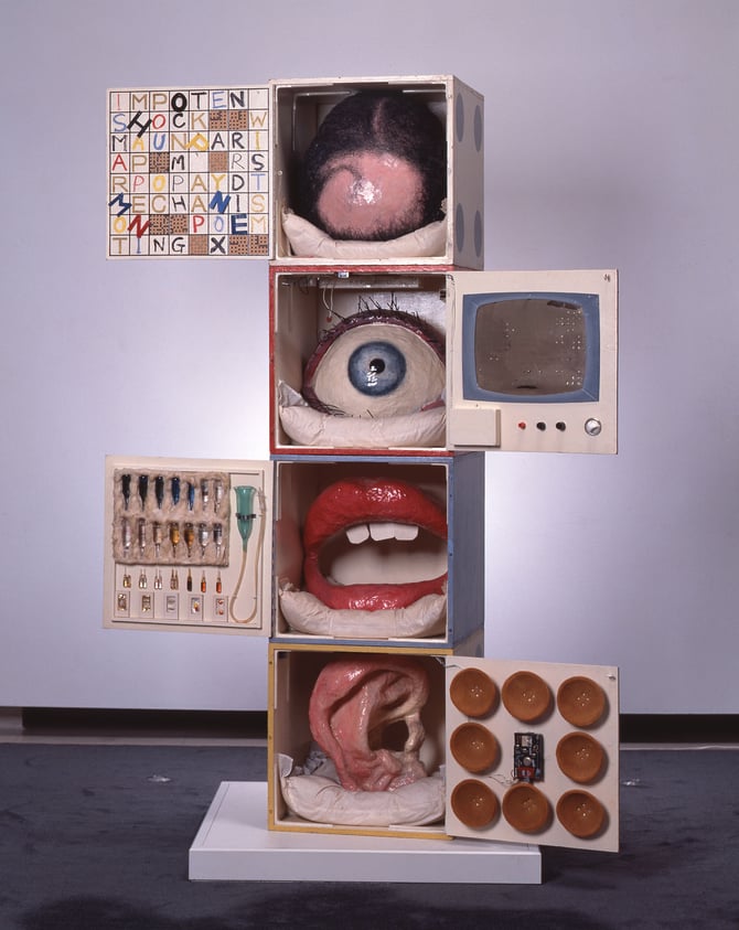 戦後日本の前衛美術において、工藤哲巳ほど、密室という言葉が似合う作家は多くない。彼の作品は開放的な空間を志向するのではなく、むしろ閉じられた環境を前提に成立している。ケージ、箱、水槽、庭のような小規模な領域が反復され、その内部には人体の断片や植物、電線、プラスチックといった異質な要素が同居する。観客はそれらを鑑賞するというより、密閉された生態系を覗き込むような姿勢を強いられる。