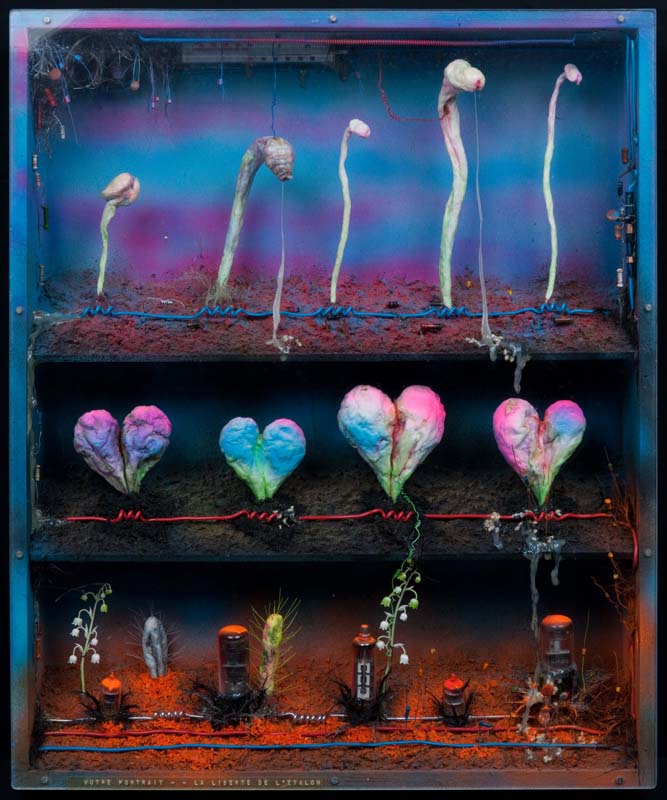 工藤の作品を特徴づけるのは、人間が中心的存在として描かれない点である。身体はしばしば断片化され、植物や人工物と結びつき、時には生殖器や神経のような部分が異様な形で提示される。それらは怪物というより、人間の延長として現れる。重要なのは、異物が人間を侵略するのではなく、人間そのものが環境の一部として変形しているという前提である。