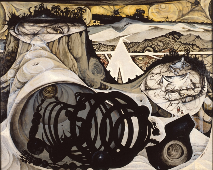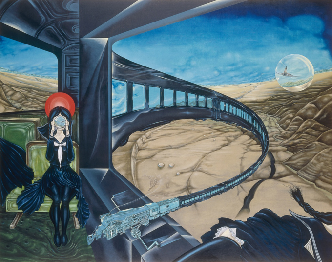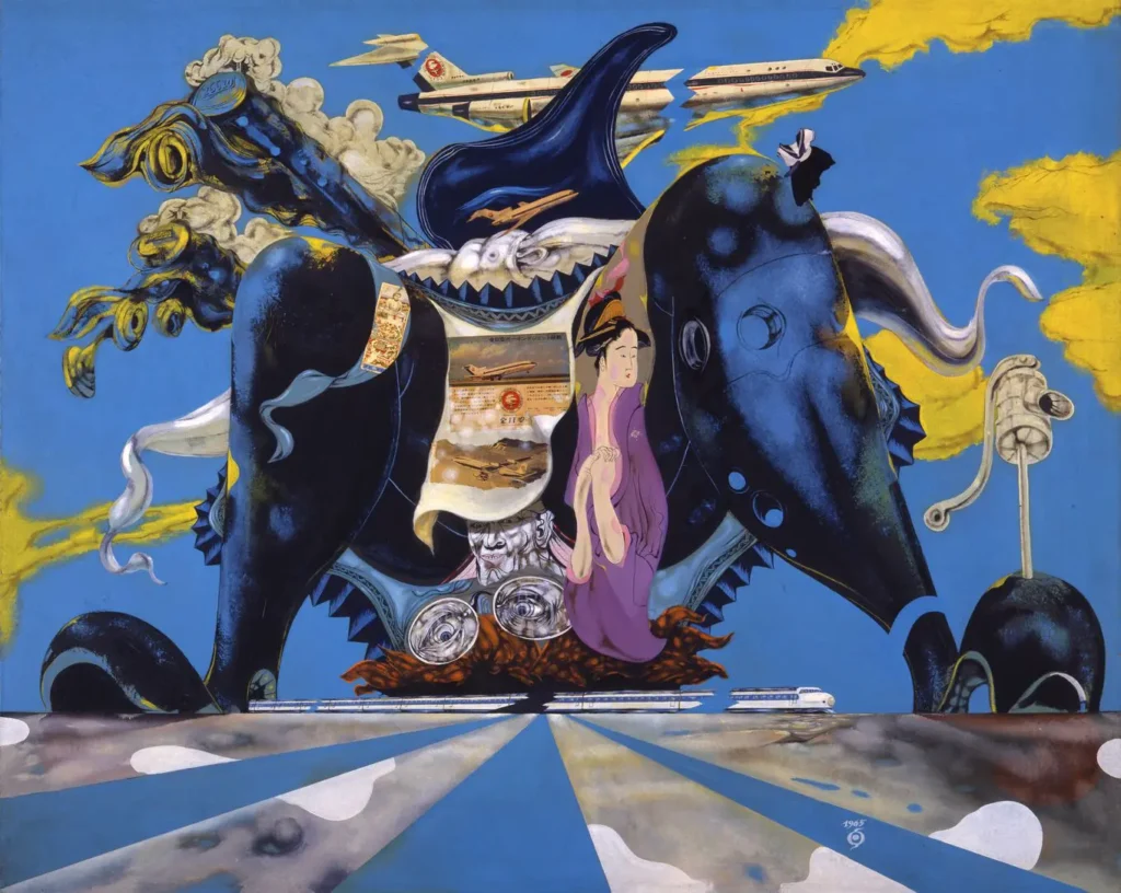 戦争の気配を帯びた荒野や列車、瓦礫の広がる遠景の手前に、突然漫画のような顔が現れる。目は一つしかなかったり、太い線で輪郭だけが強調されていたりする。その顔は泣いても怒ってもいない。感情の出口が閉じたまま、ただそこに置かれている。そのとき画面には、重い歴史的背景と軽い記号的存在が同時に立ち上がり、観る者はどちらにも完全には寄りかかれない奇妙な均衡の中に置かれる。この均衡こそが、中村宏の絵画を特異なものにしている。