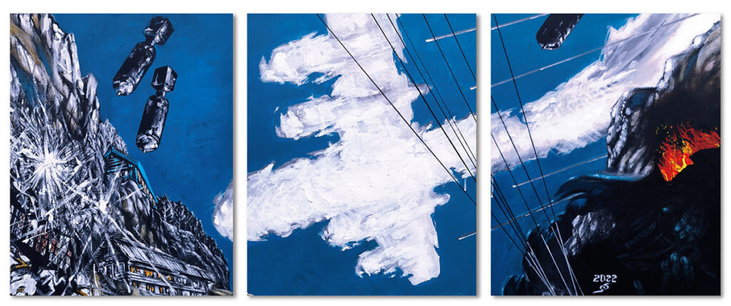 このとき虚無の顔は、混在を可能にする中立的な面として働く。感情を固定せず、判断を保留したまま、観る者を画面の前に留める。その留まりの感覚が、絵画への信頼と結びついている。描く行為が観客につながるという確信があるからこそ、彼は表現の振れ幅を恐れない。写実的な戦争の描写から、比率の崩れた顔や単眼の記号、漫画的な線描へと自在に移行しながらも、画面は一貫して観客に開かれている。この開かれ方が、シニカルな批評性を回避し、畏敬に近い感情を呼び起こす。