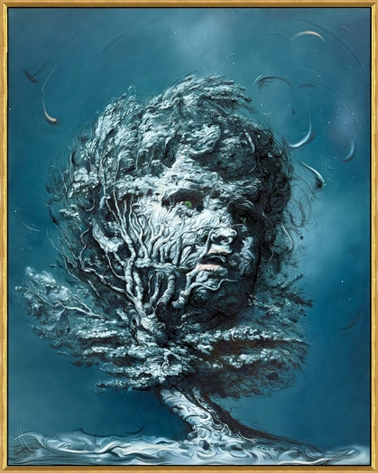 ブラウンの制作は、美術史の名画を直接写すことから始まらない。彼は印刷物や図版、既に複製されたイメージを参照する。たとえばレンブラントやフランク・アウアーバッハの作品、さらには幻想絵画やSF的イラストレーションなど、出発点は多層的である。しかしそれらは徹底的に変形され、拡大され、色彩を誇張され、ほとんど原形をとどめない。
