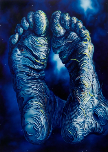 ブラウンの絵画もまた、アナログでありながらCG的な質感を帯びる。光沢は誇張され、陰影は劇的で、表面は滑らかすぎる。この「強い表面」は、1990年代の視覚文化のリアリティと無縁ではない。彼の絵画は古典的でありながら、同時に未来的に見える。なぜならそこでは、肉体が霊的存在であると同時に、デジタル的流動体でもあるからだ。