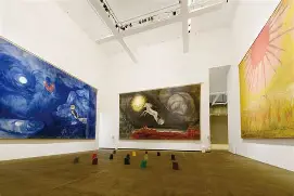 舞台芸術との関わりも重要である。ロシア・フランス・アメリカの舞台で制作したバレエやオペラの舞台装置は、大画面における“浮遊する構図”をさらに拡張した。舞台上では人物や動物が重力を越え、巨大な色面が踊る。その視覚的躍動は、シャガール絵画の空間感覚を逆に拡張し、絵画と舞台が互いを映し合う「相互増幅」を成した。青森県美術館が所蔵するバレエ《アレコ》の大舞台幕はその象徴的な成果であり、巨大な青の波動の中で人物や動物が漂うその空間は、彼の浮遊性のスケールを体感的に示している。