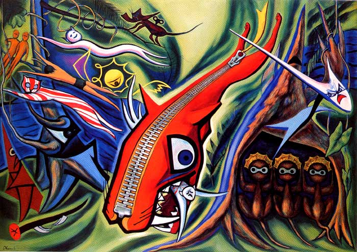 岡本の言葉は、作品以上に生々しい説得力を持つ。「芸術は爆発だ!」は単なる気勢ではなく、異質なもの同士が化学反応を起こす瞬間の比喩であり、芸術とは既存の形式が崩れ、異物が混ざることで新しい生命が生まれる“文化的発酵”の行為を指す。彼の絵画、彫刻、陶芸、書、デザインはすべて、発酵しすぎて爆発寸前のエネルギーを孕み、「具を入れすぎたカレー鍋」を敢えて沸騰させるような作為を示す。この態度は、モンドリアンらの「形式的純度」を目指すモダニズムとは正反対であり、岡本は矛盾や不純さを抱えたまま生きることを芸術とみなした。興味深いのは、この言葉の力強さと、中後期の作品に見られる軽やかでポストモダン的な表現との乖離である。言葉が哲学や思想を語る一方、作品は観る者の体験に委ねられ、象徴やユーモアを伴った柔軟な創作となる。ここに、岡本の「信念の体感化」と「創作体験の純化」が現れている。