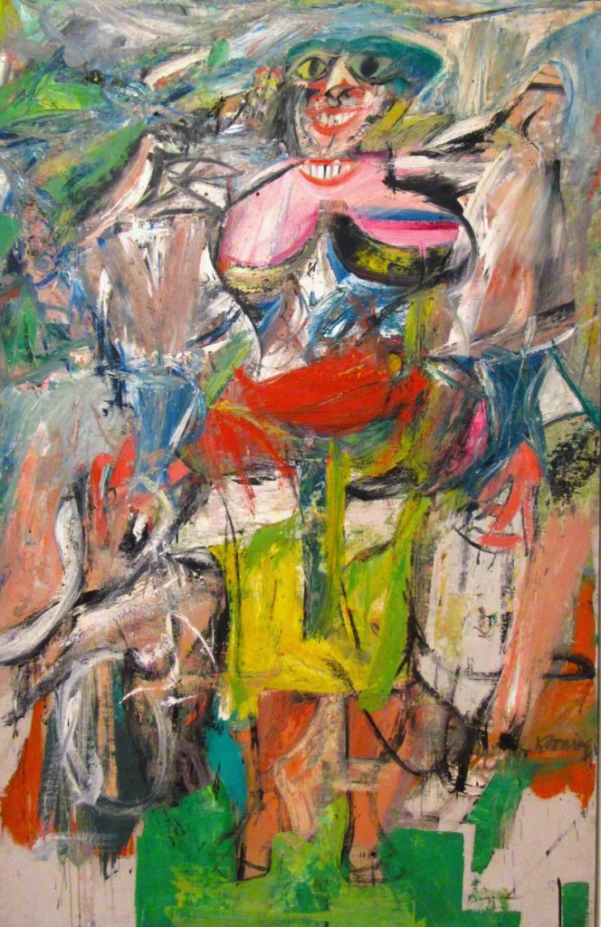 しかし、クーニングは単なる神経質な自己表象に留まらず、やがて抽象表現の世界に足を踏み入れる。ここでは、衝動的な筆致とモチーフの形態の狭間での格闘が画面の中心テーマとなる。彼は特に女性像を多用するが、個々の女性を精密に描写するのではなく、瞬間的に視覚イメージを切り取り、画面に解き放つ。その存在は、観る者に具体的な人物としての認識よりも、身体的エネルギーや感覚の強度として印象付けられる。初期の神経質な人物像とは対照的に、身体的・環境的安全の確保が、内面の緊張を解放し、衝動的な表現へと昇華させたのである。