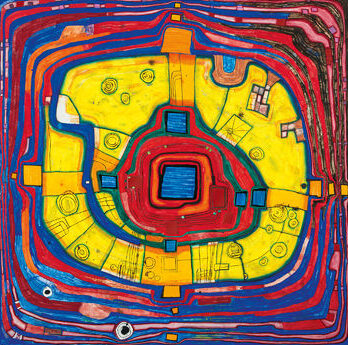 ベクシンスキのように心理空間が増殖する“内的建築”とも比較されることがあるが、フンデルトヴァッサーの中心にあるのは絶望の深淵ではなく、生命の螺旋的上昇である。世界を流動的な多層構造として捉え、それを可視化しようとする点で、フンデルトヴァッサーはヴィジョナリー・アートの系譜に広く属している。直線ではなく曲線、静止ではなく生成、閉じた円ではなく開かれたスパイラル――その思想は彼のすべての表現を貫く根源的構造として理解される。