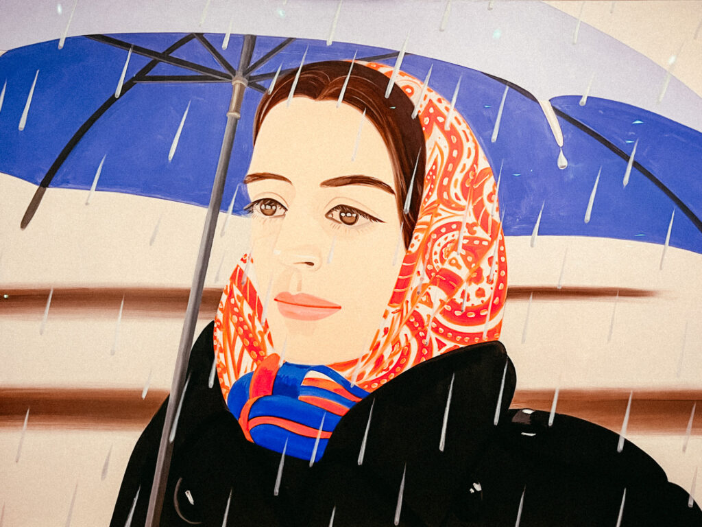 カッツの絵画に日本的な感覚、特に浮世絵の平面性を感じ取ることは自然である。そこにあるのは、遠近法による奥行きの再現ではなく、画面全体を横断するリズムである。背景は単純化され、人物や樹木は輪郭によって切り出される。視線は奥へと誘導されるのではなく、表面を滑るように移動する。このリズム感は、浮世絵における文様や構図の感覚と深く共鳴している。